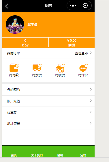 12.“用户中心”页面中有“我的预约”,点击之后,页面中会有订单的状态“待付款”、“待服务”“已拒单”“待评价”以及“全部”,点击都可以看到该状态下的订单内容: